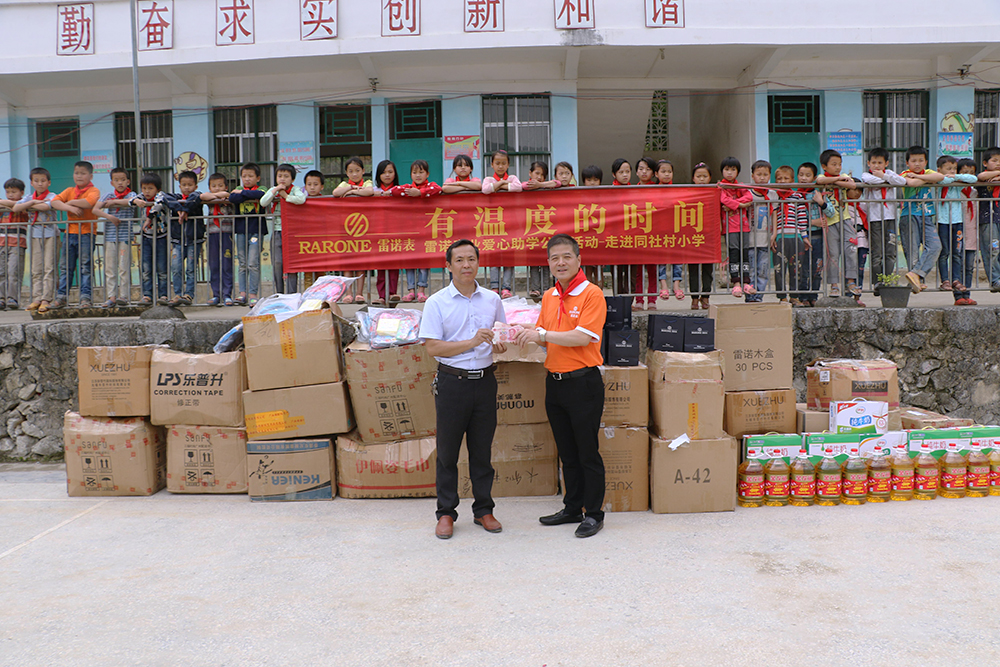 雷諾表夜色系列新品發布會剛剛落幕,在女神董潔和南寧眾多粉絲的見證下,雷諾表向廣西河池市大化瑤族自治縣百馬鄉同社村小學捐贈10萬愛心物資及義款。5月2日上午,雷諾表愛心助學小組帶著愛心物資來到同社村小學。