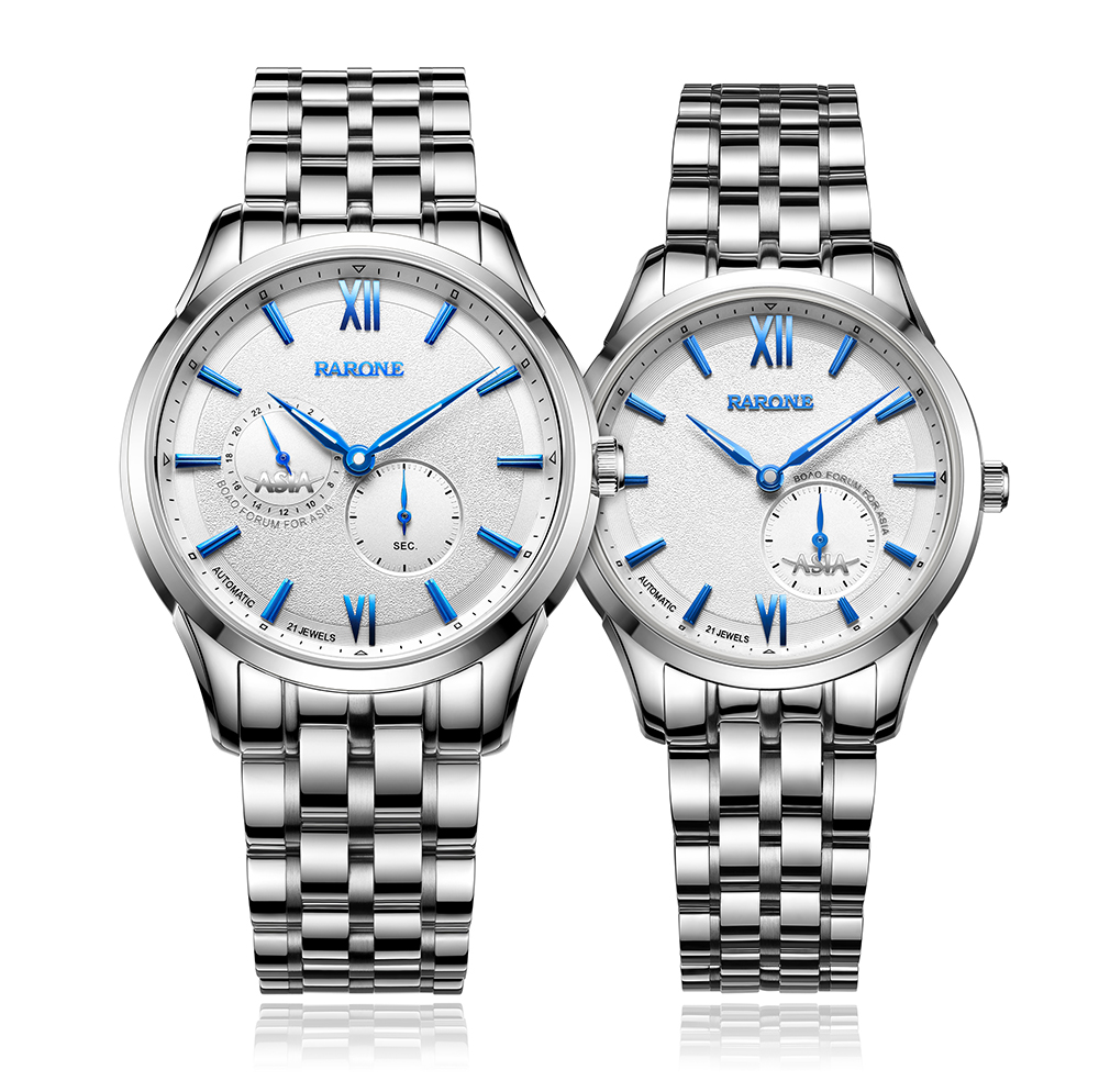2016年新品以男女對表形式呈現(xiàn),搭載進(jìn)口全自動機(jī)械機(jī)芯,透視底蓋清晰可見機(jī)芯運(yùn)作。男女表在設(shè)計(jì)細(xì)節(jié)上做了區(qū)別,更加匹配男女士對美的不同追求。除了經(jīng)典的黑色,間金色之外,新款首次采用鋼藍(lán)色表針和字釘,為商務(wù)用表融入活力元素,同時(shí)視覺上更加清爽。大兩針搭配60秒功能小眼顯示時(shí)間,為當(dāng)下手表的熱門設(shè)計(jì),男表9時(shí)位增加一個24小時(shí)功能小盤,方便知曉和調(diào)教多維度時(shí)間。表盤上的“ASIA”標(biāo)識體現(xiàn)腕表的身份和紀(jì)念價(jià)值。